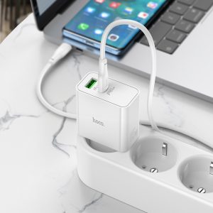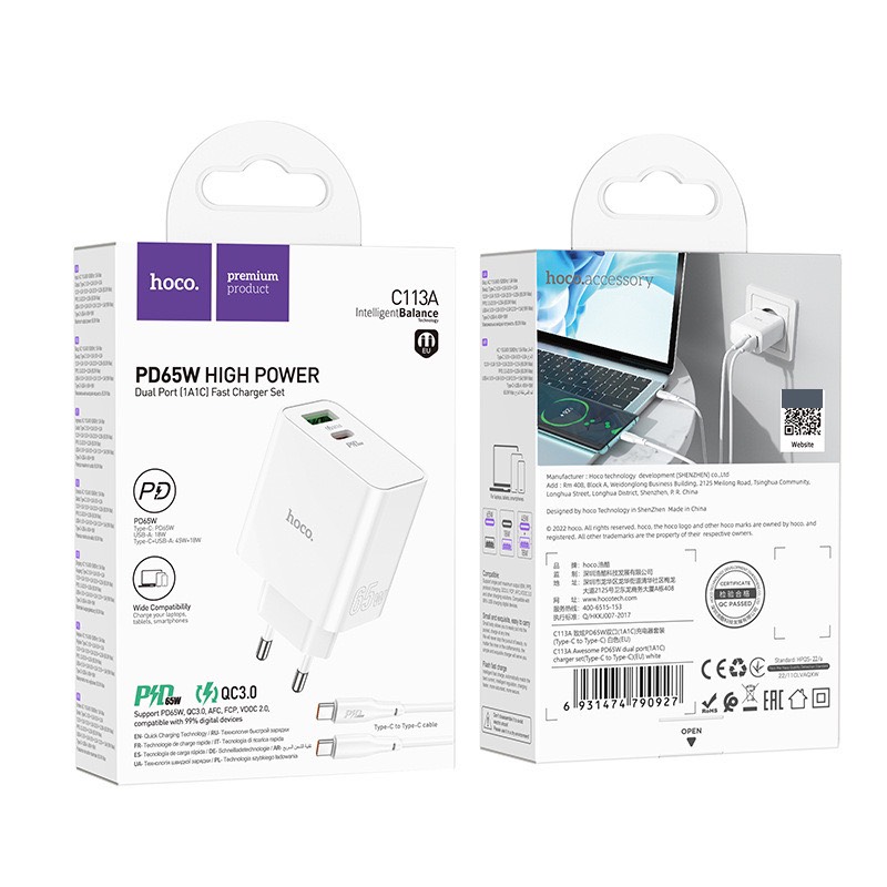 Bộ sạc Hoco C113A PD65W GaN cổng kép (1A1C) (Type-C đến Type-C) (EU)